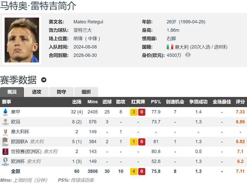 雷特吉原本在阿超踢球的,自从选择代表意大利出战国际比赛之后,雷特吉于2023年夏窗以1525万欧元的转会费登陆意甲加盟热那亚,2023-24赛季31场9球3助。雷特吉一年之后,也就是2024年夏窗2090万欧元的转会费转投进攻型球队亚特兰大,于是乎2024-25赛季刷出了49场28球9助的傲人数据,其中36场意甲25球8助,夺得了上赛季的意甲金靴。